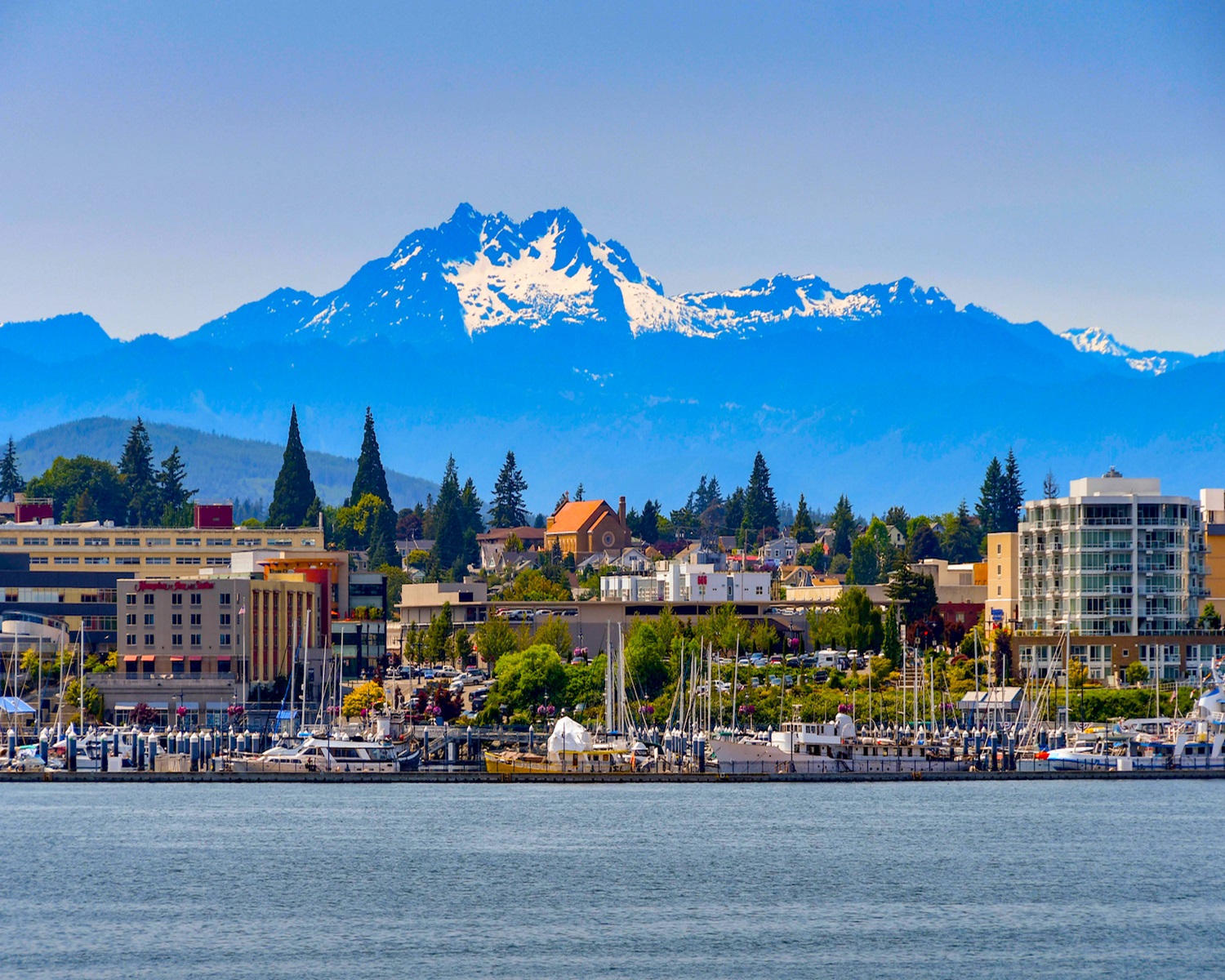 BREMERTON, WASHINGTON STATE, USA – JUNE 2018: Wide angle view of the marina and waterfront in Bremerton, WA, with a backdrop of snow cappped mountains.