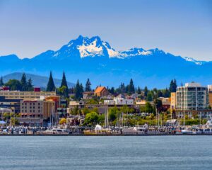 BREMERTON, WASHINGTON STATE, USA – JUNE 2018: Wide angle view of the marina and waterfront in Bremerton, WA, with a backdrop of snow cappped mountains.
